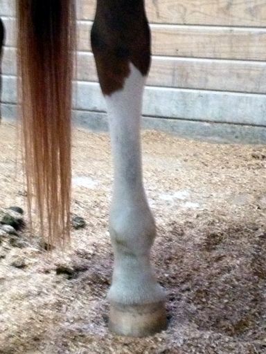 When I found him, he couldn't walk up to the barn. He ALWAYS walks up to greet me when I get there. So when he wouldn't walk up, I knew something was wrong. I went out to him and he wasn't putting any weight on that leg. It was SWOLLEN all the way passed the knee, into his thigh. There was a little heat from his stifle all the way to his hoof. I picked up some meds and we kept him in that night. I had it worked out to let him go out in a small flat pasture during the day (opposite of everyone else). We did that for a few days. The swelling went down quite a bit.