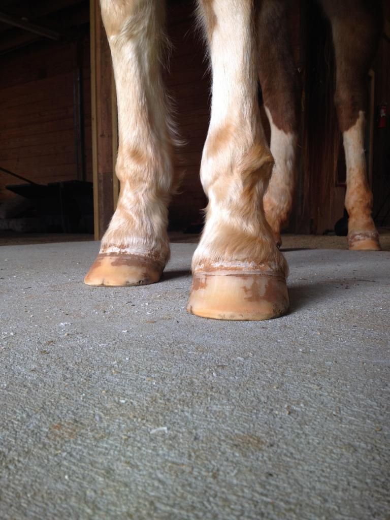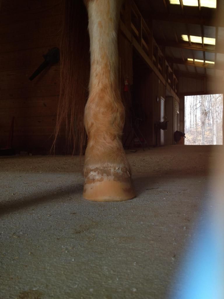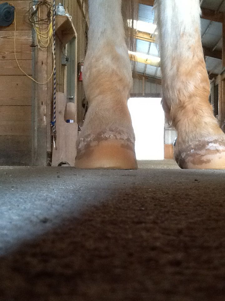 Here are the updated photos of his feet. He definitely needs to grow more foot in order for her to get everything in the correct place. But she did darn well considering he has no hoof on one foot and the other is wonky in the front.